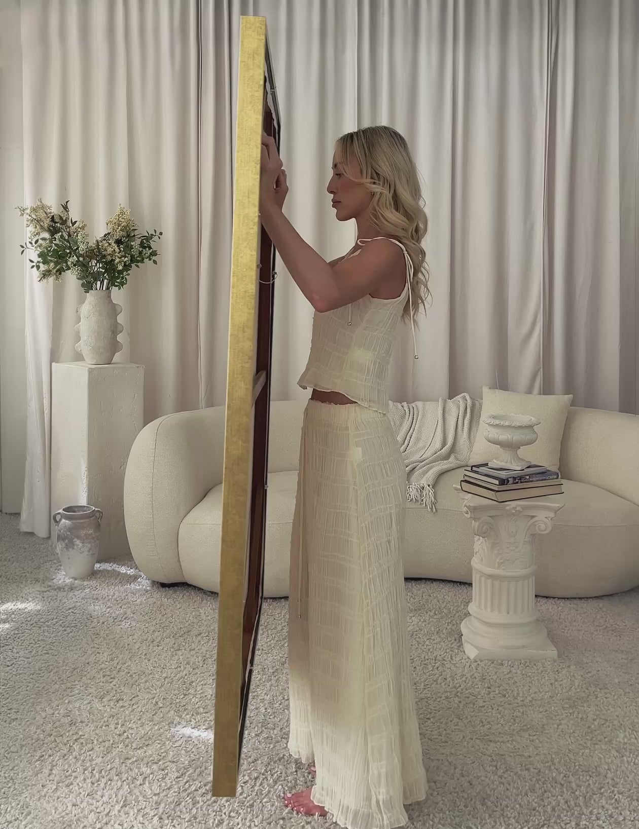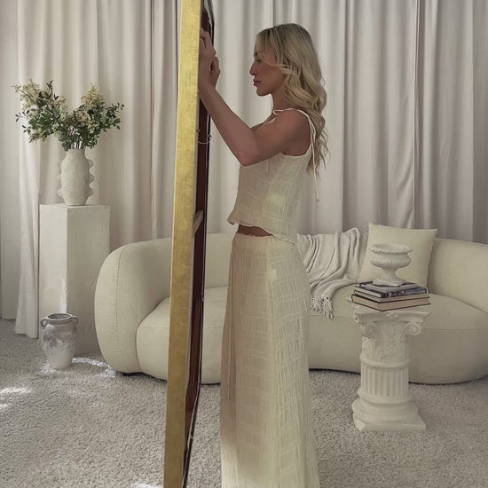 Blessed Is She framed canvas print. A faithful woman joins her hands in prayer. Meticulous hand-drawn linework traces her form delicately. A neutral palette of linen beige and soft ivory brings peace to her moment of blessing and faith.