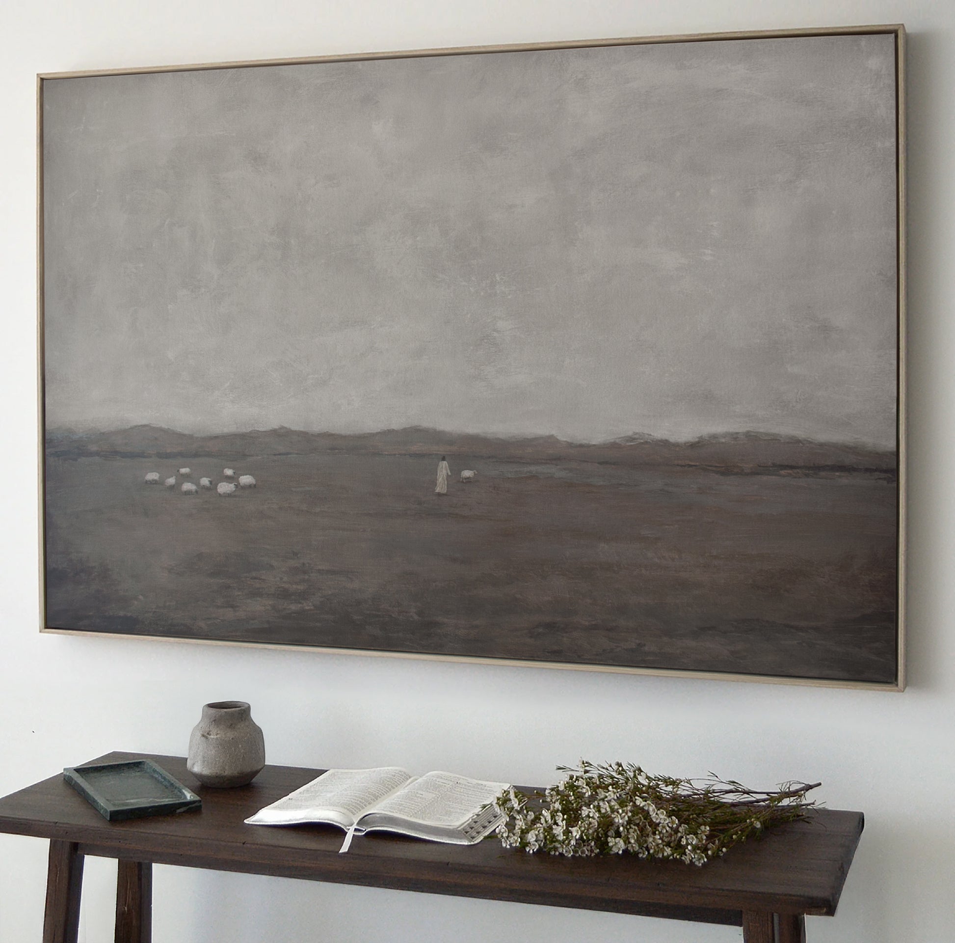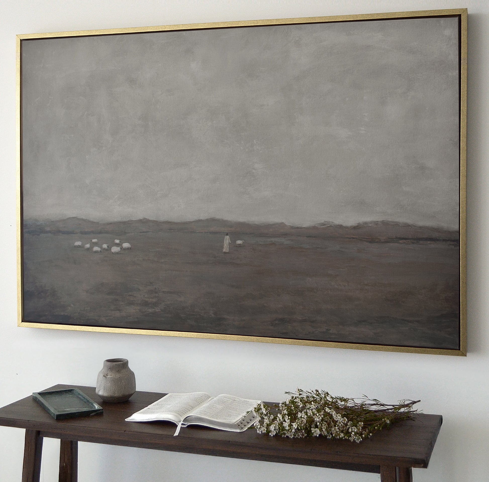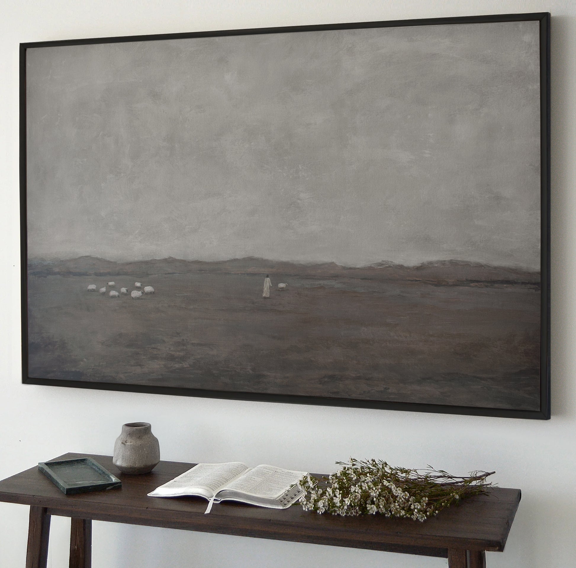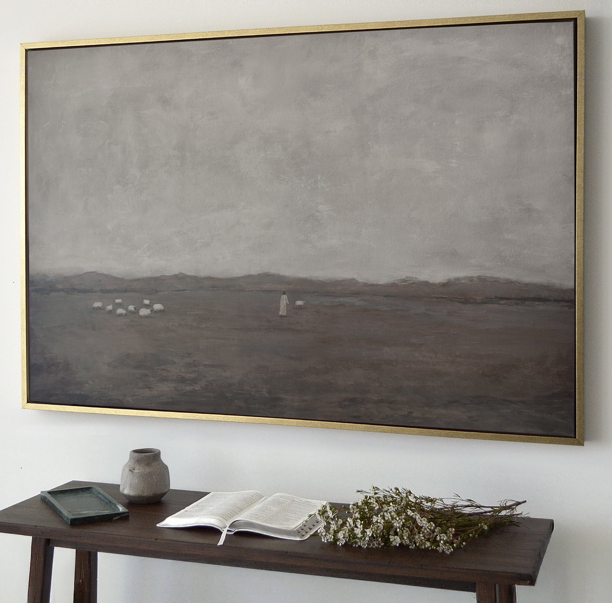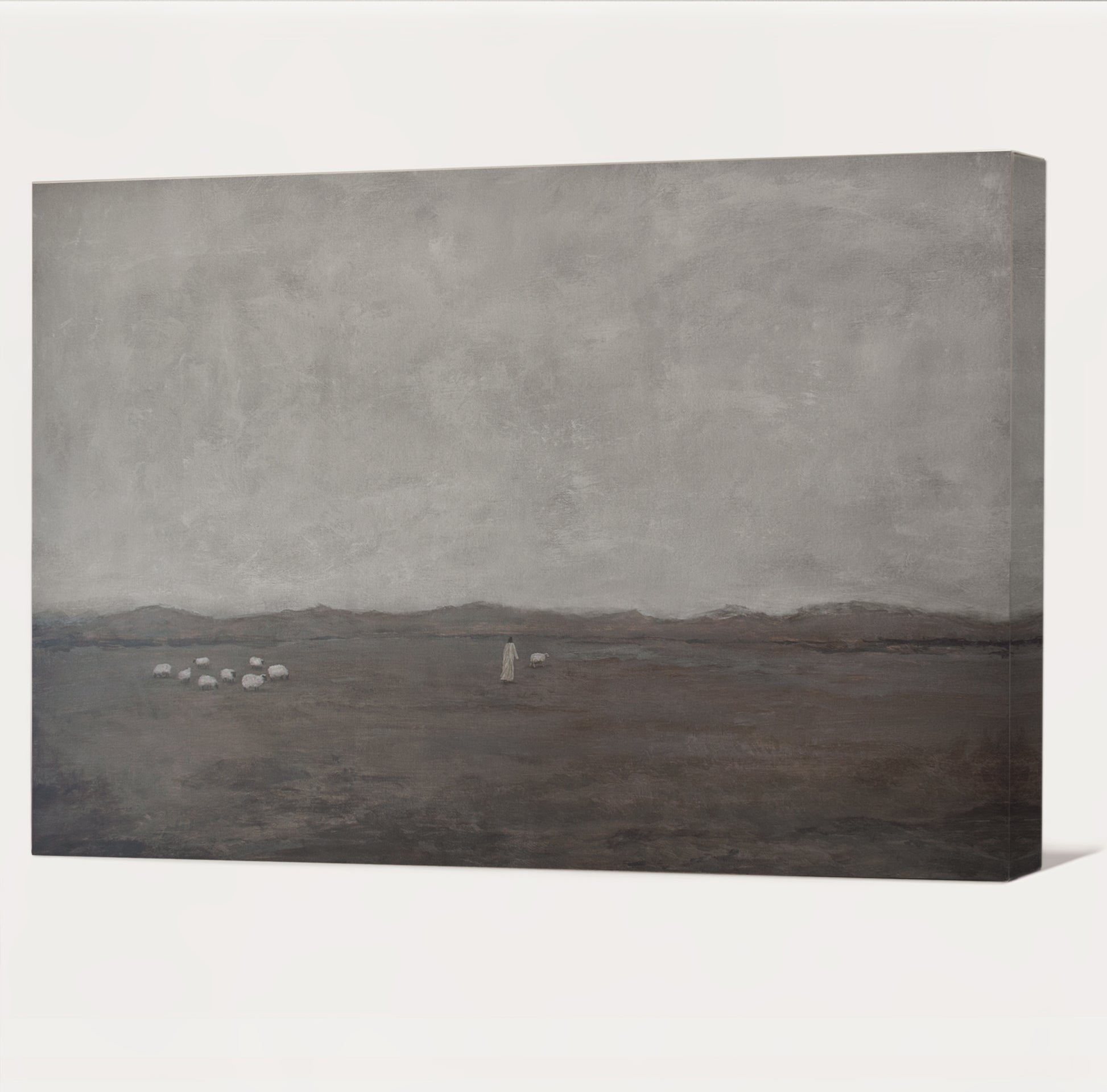 Lamb Of God premium canvas print. Jesus gently approaches a lone sheep across open meadows. Soft brushwork delicately leads the eye toward the moment of reunion. A neutral palette of muted taupe and warm clay wraps the landscape in peace and calm.