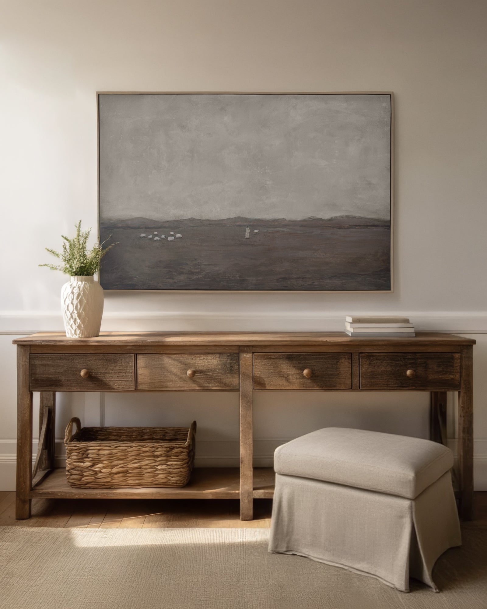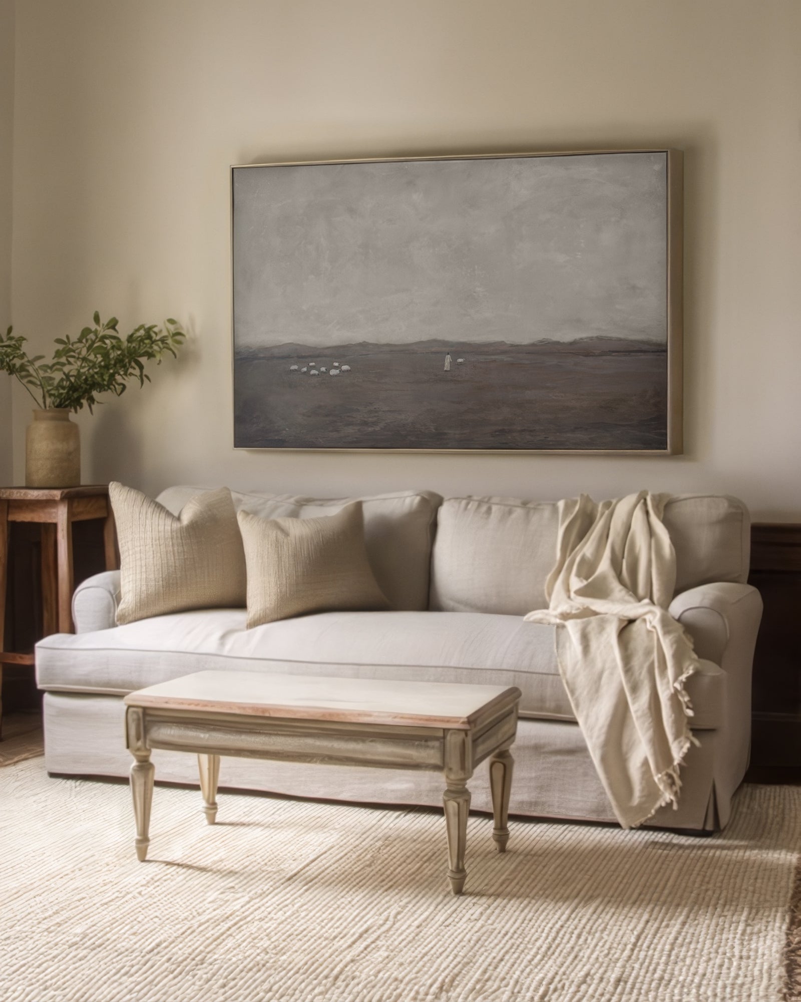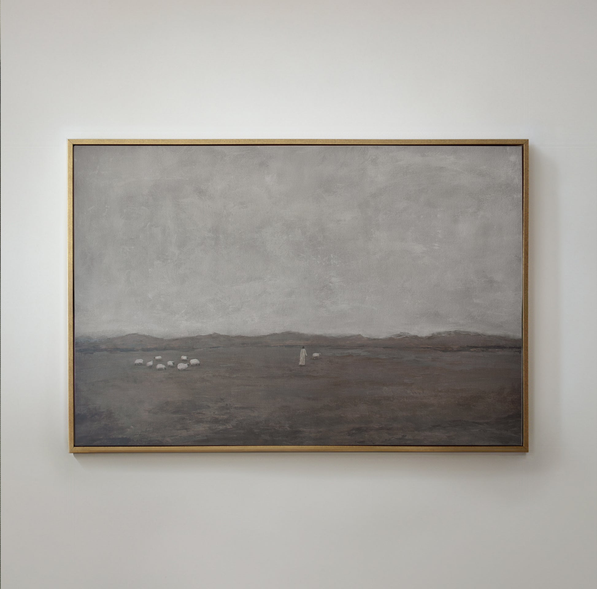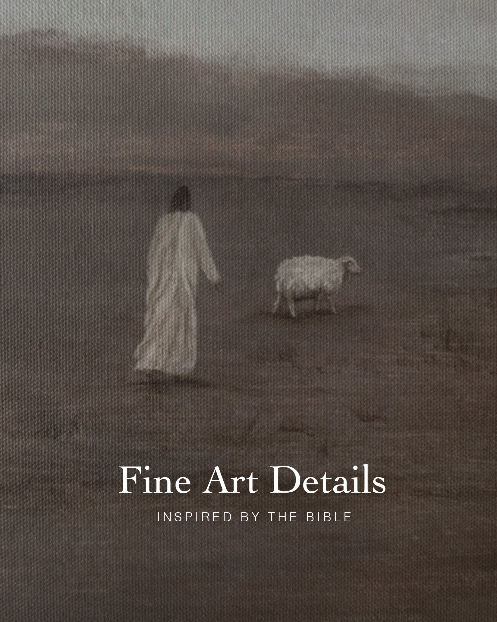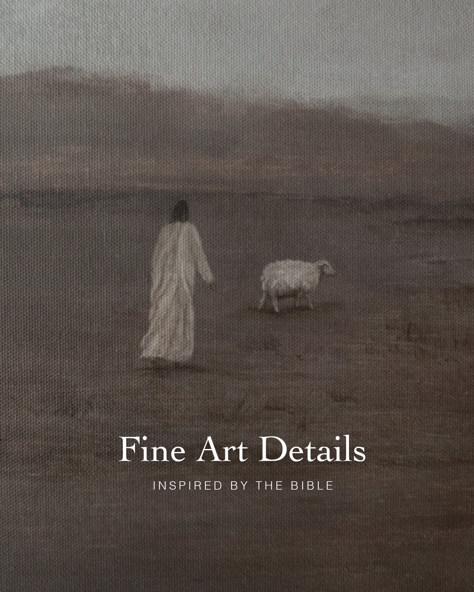 Lamb Of God premium canvas print. Jesus gently approaches a lone sheep across open meadows. Soft brushwork delicately leads the eye toward the moment of reunion. A neutral palette of muted taupe and warm clay wraps the landscape in peace and calm.