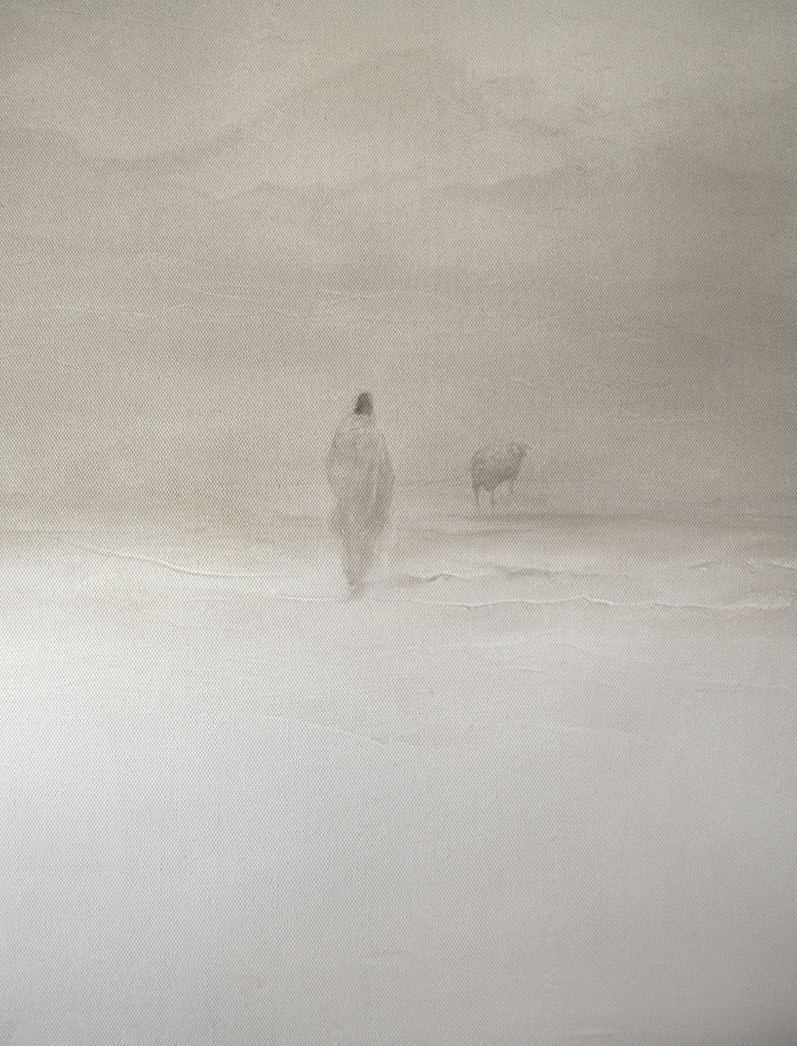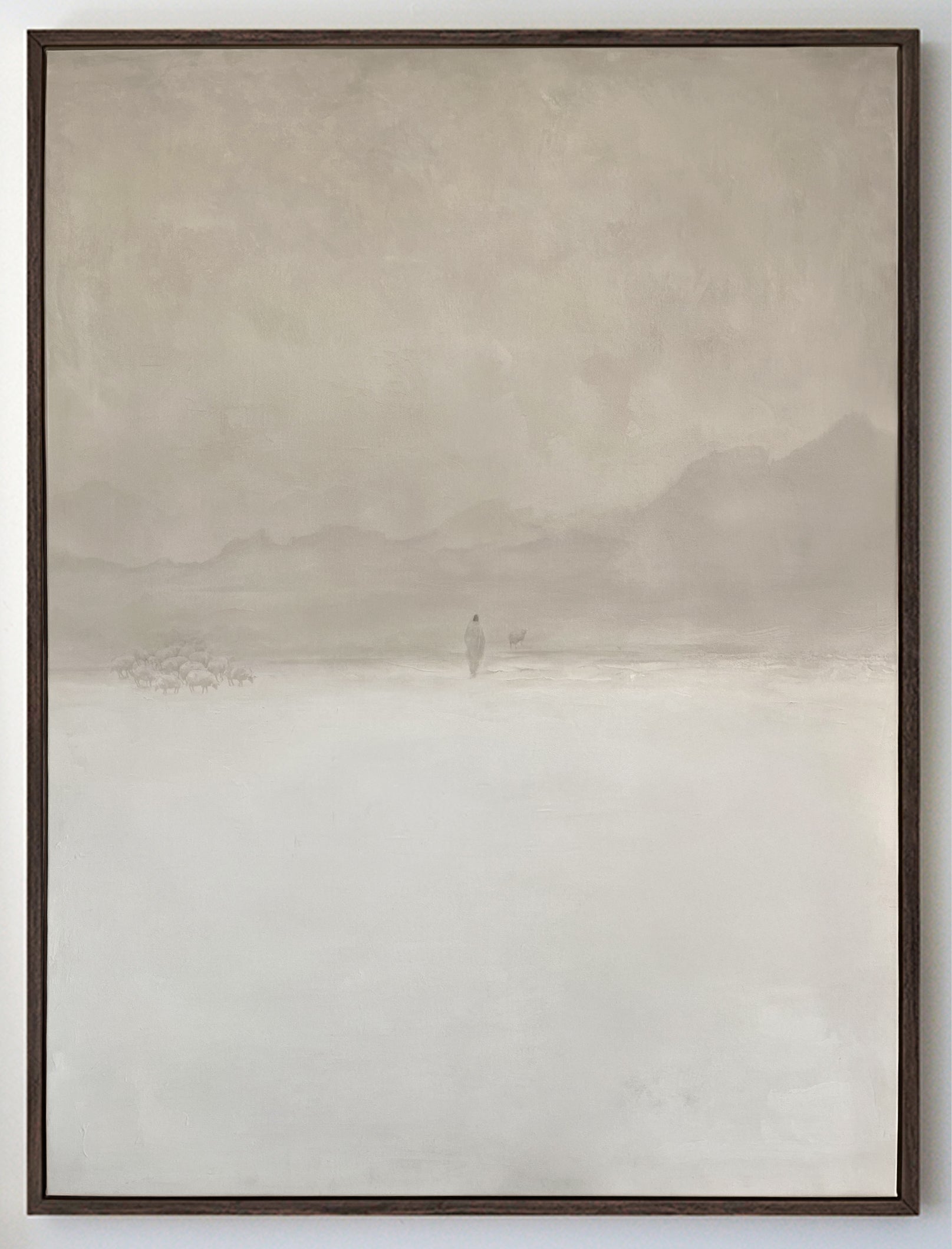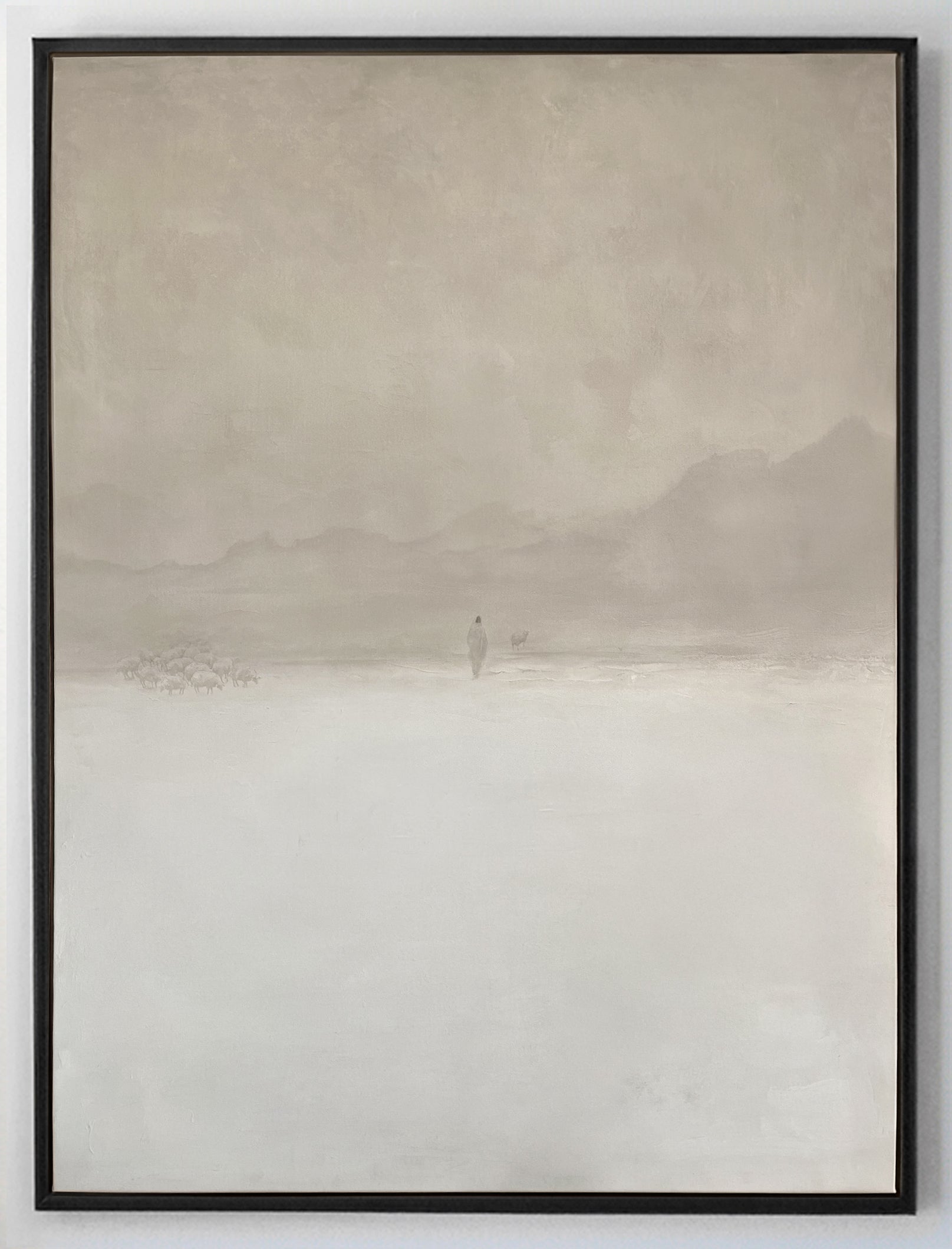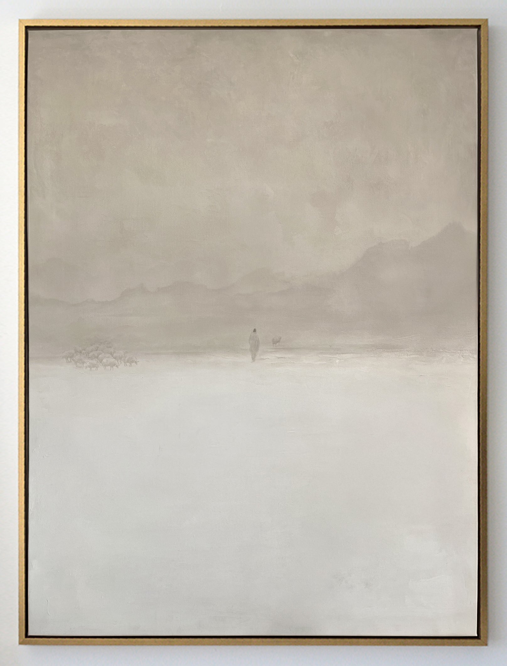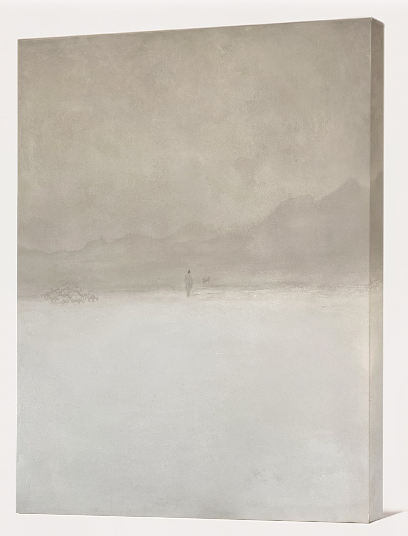 Premium canvas print of Jesus leaving the 99 for the 1 lost sheep. Featuring a serene grass field and mountain backdrop with neutral tones in beige and off-white.