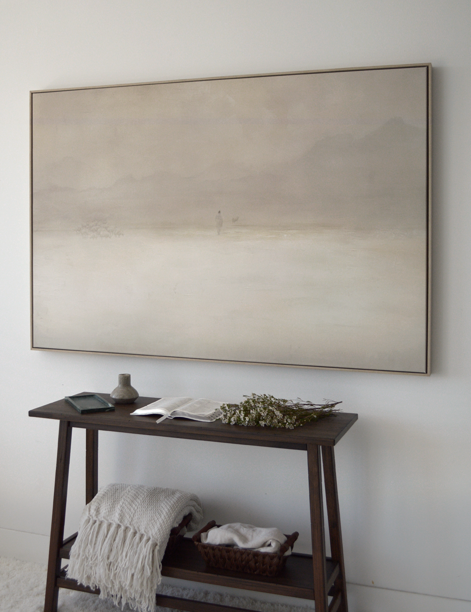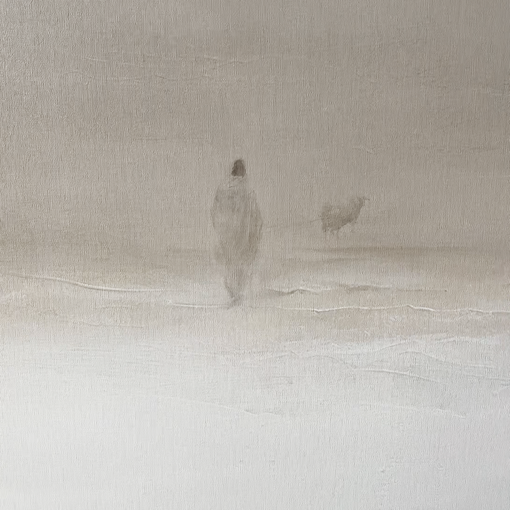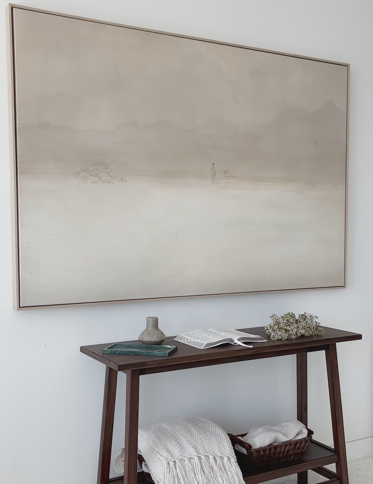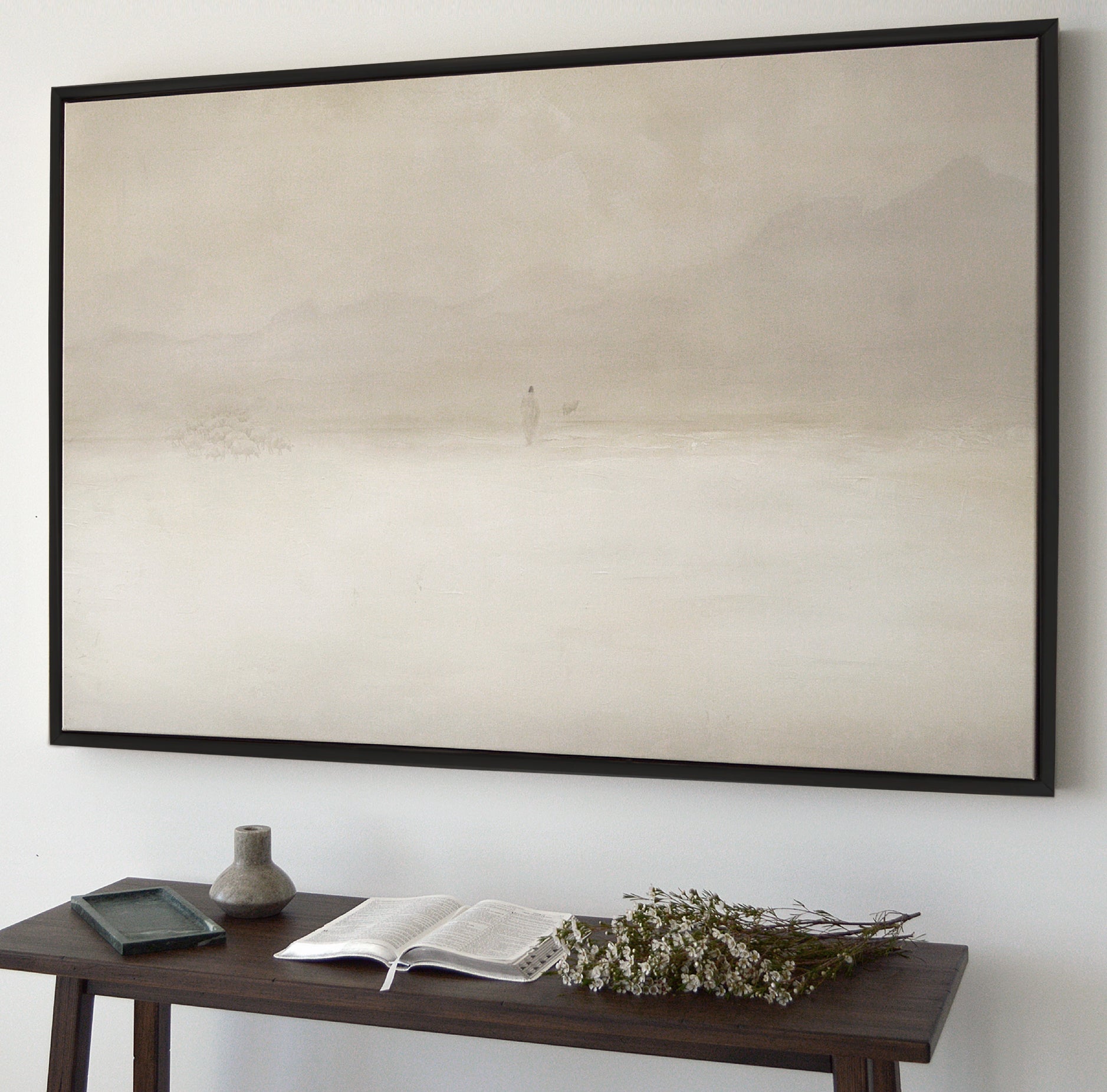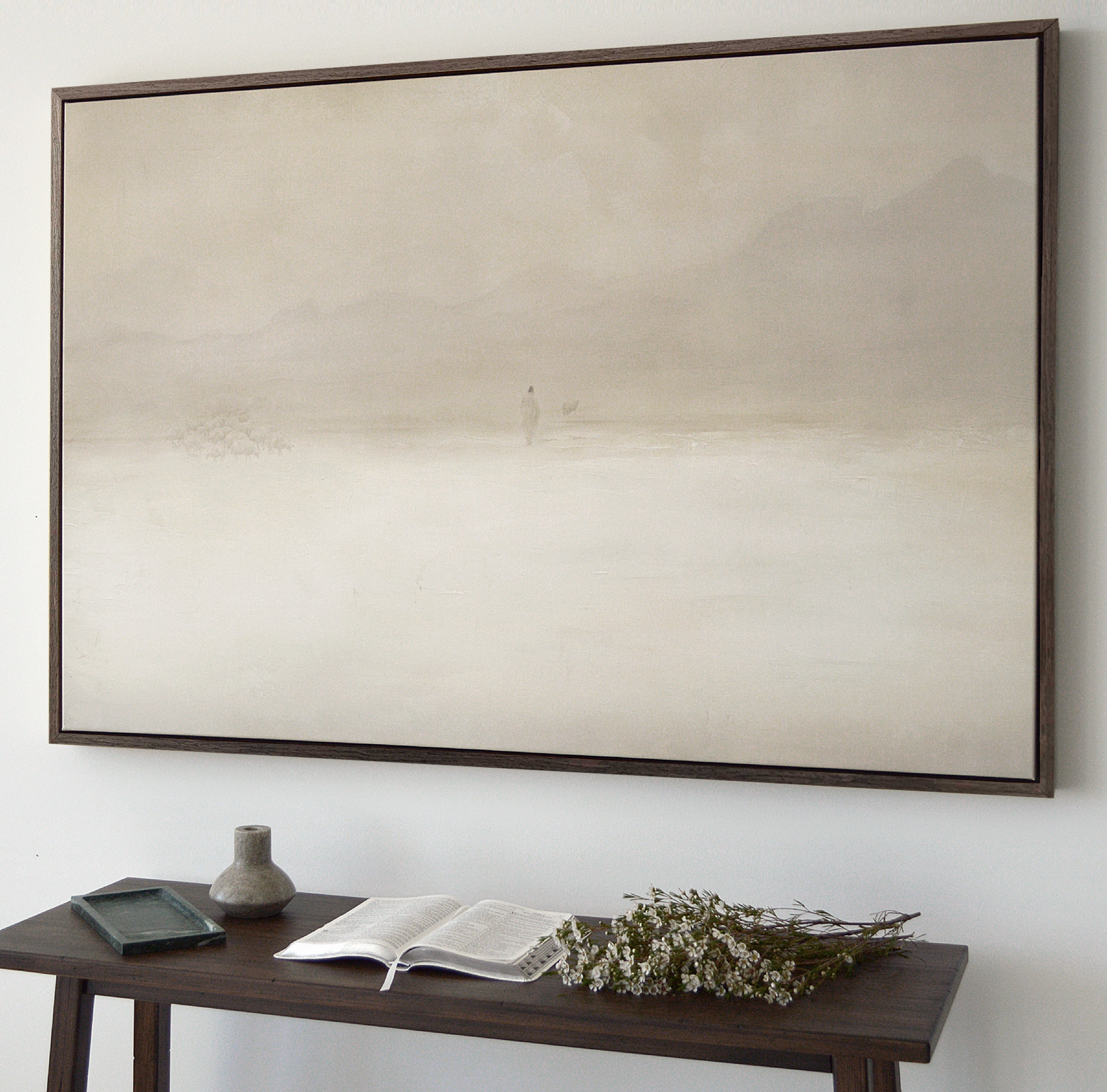 Premium canvas print of Jesus leaving the 99 for the 1 lost sheep. Featuring a serene grass field and mountain backdrop with neutral tones in beige and off-white.