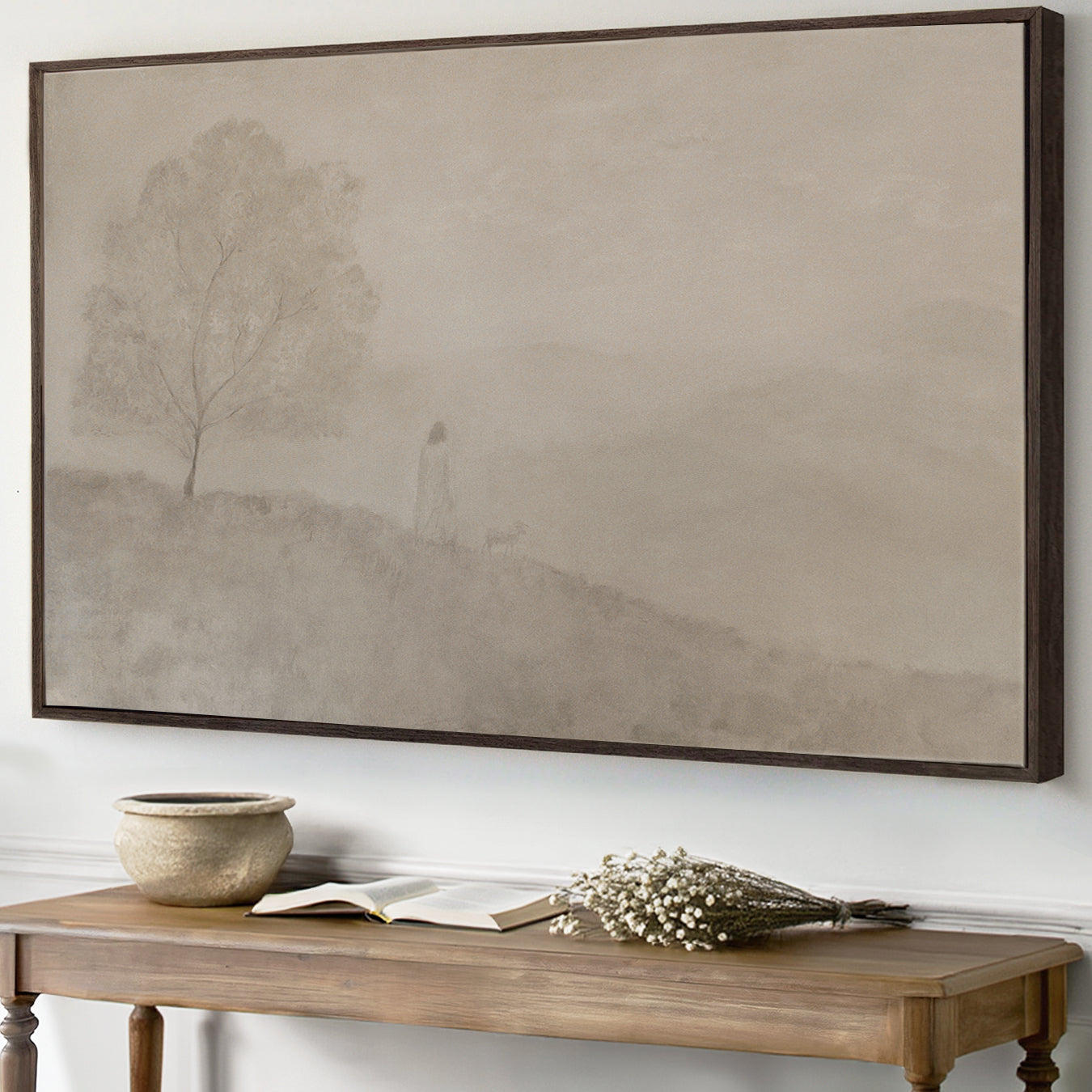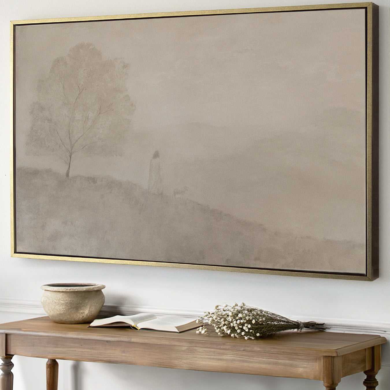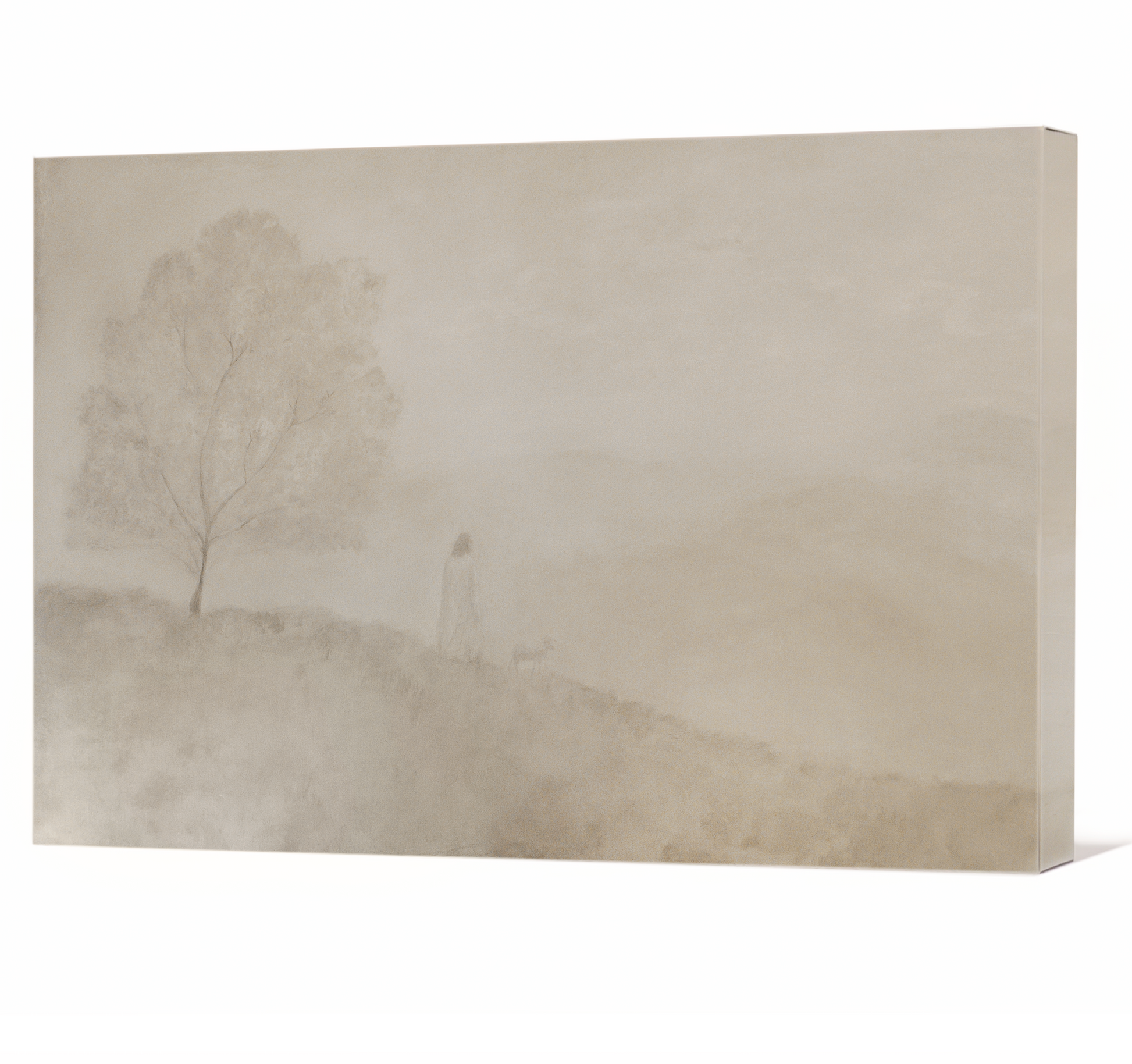 Jesus & The Lost Sheep premium canvas print. Jesus gently finds His lost sheep on a peaceful hillside. Soft brushwork delicately traces the lone tree and open pastures. A neutral palette of linen beige and soft ivory brings calm to the moment of reunion.