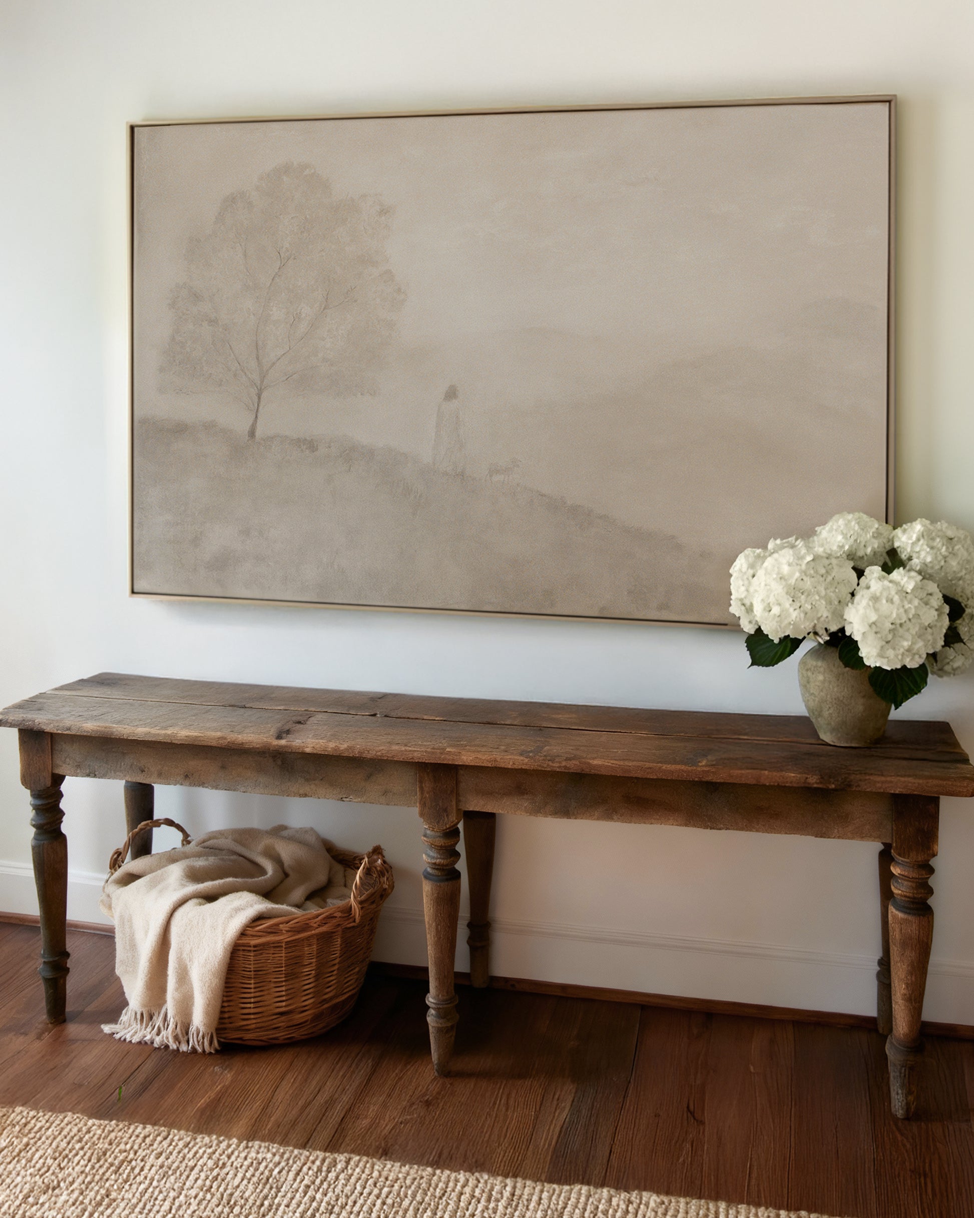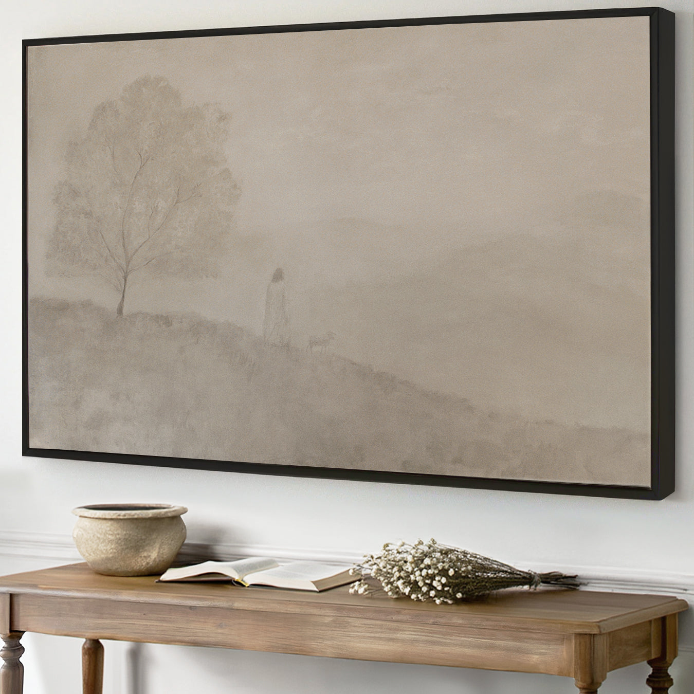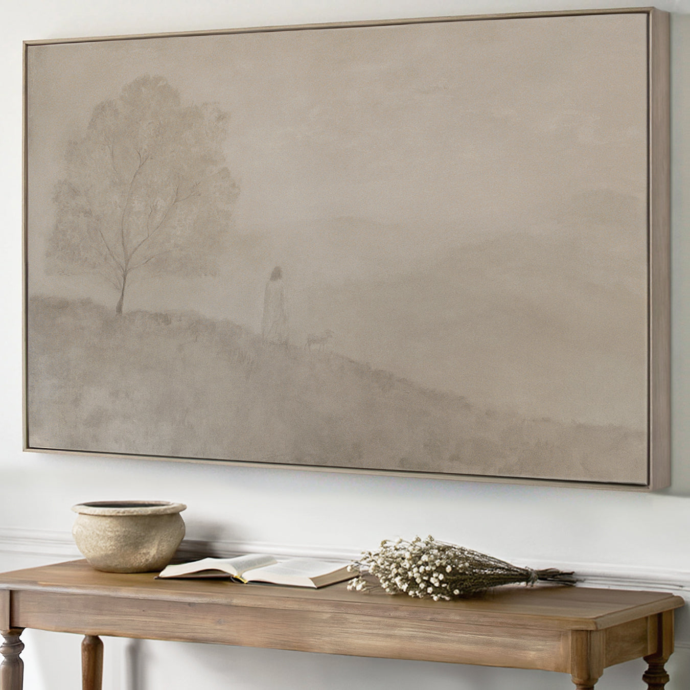 Jesus & The Lost Sheep premium canvas print. Jesus gently finds His lost sheep on a peaceful hillside. Soft brushwork delicately traces the lone tree and open pastures. A neutral palette of linen beige and soft ivory brings calm to the moment of reunion.