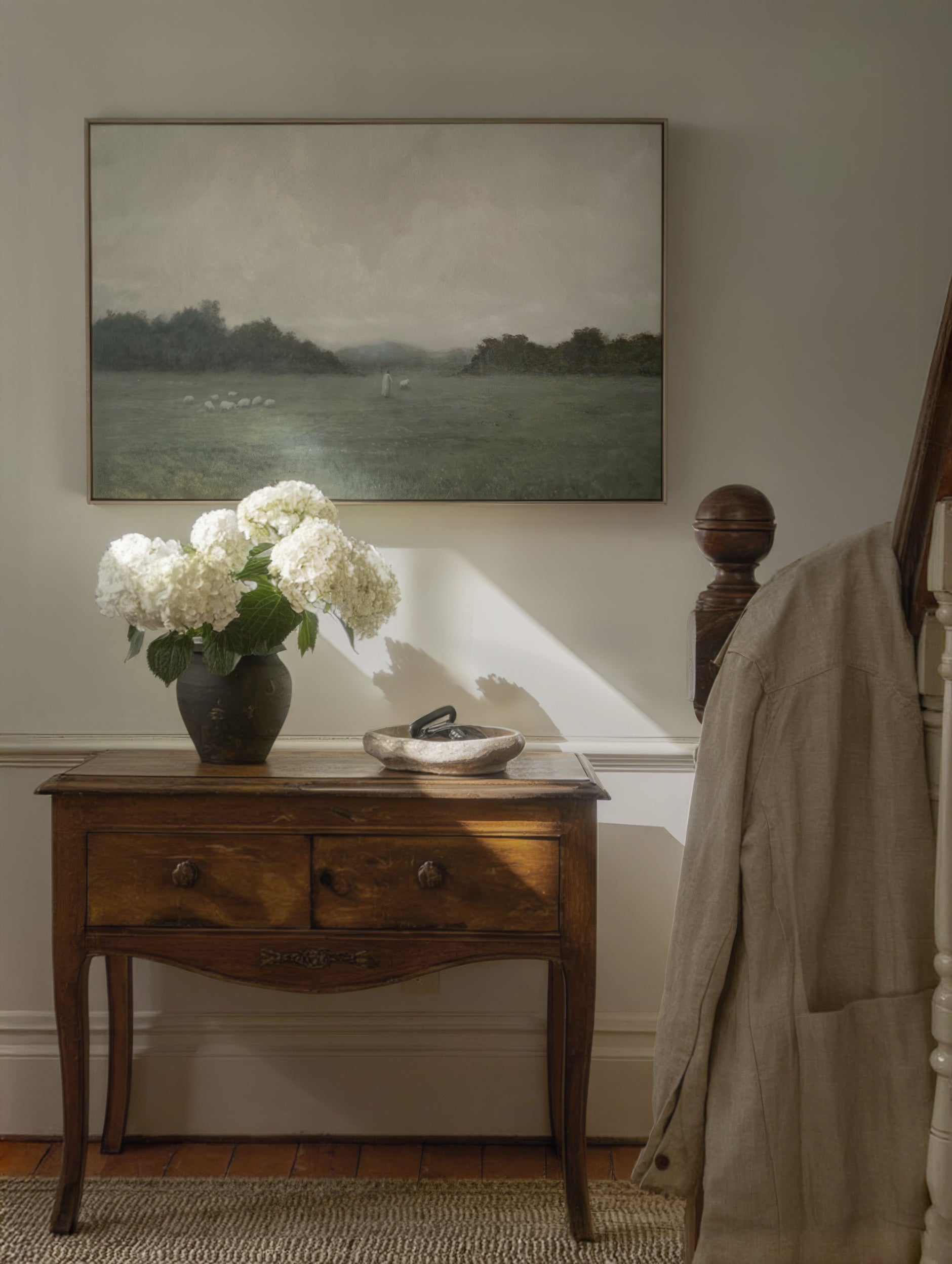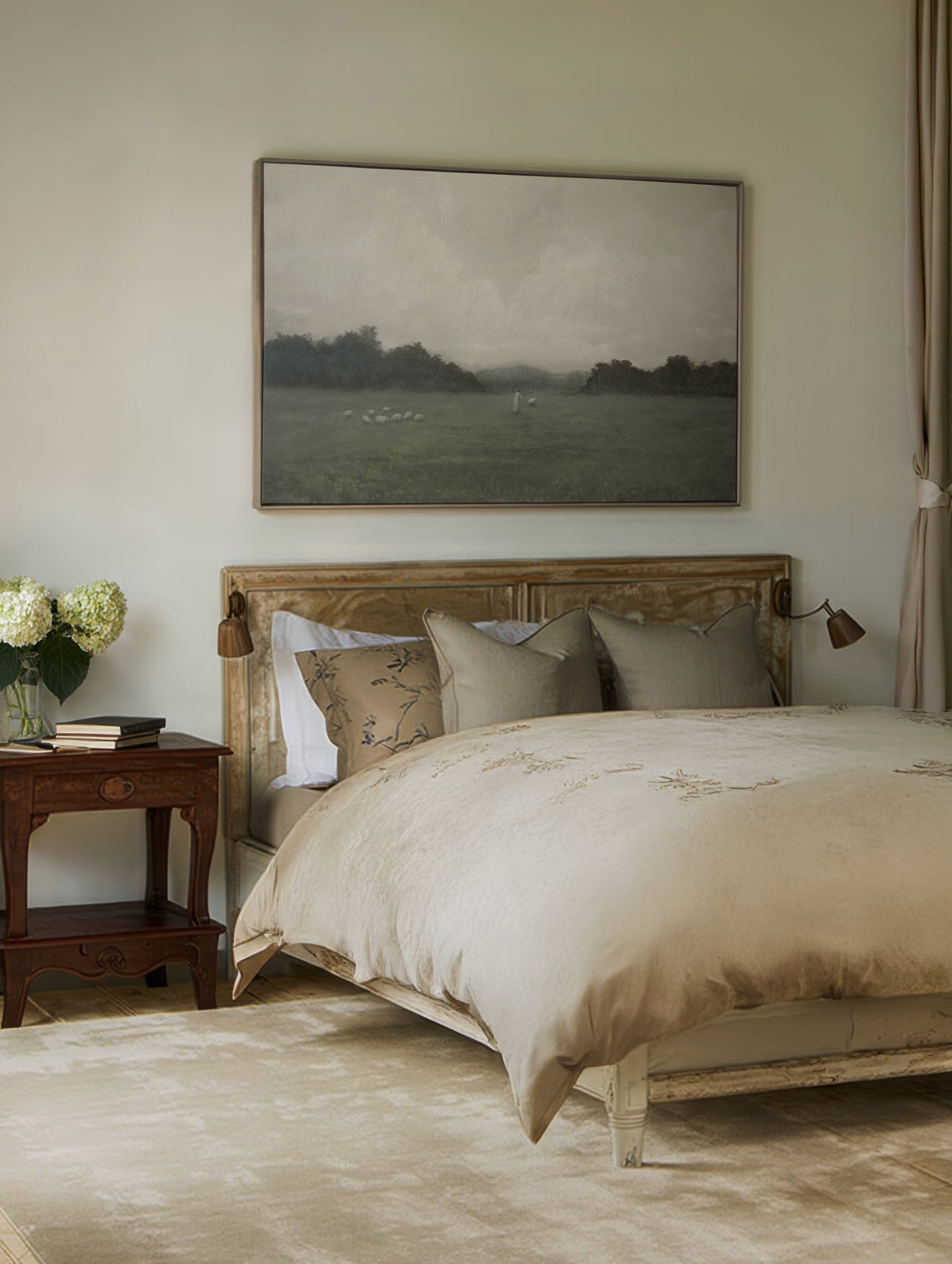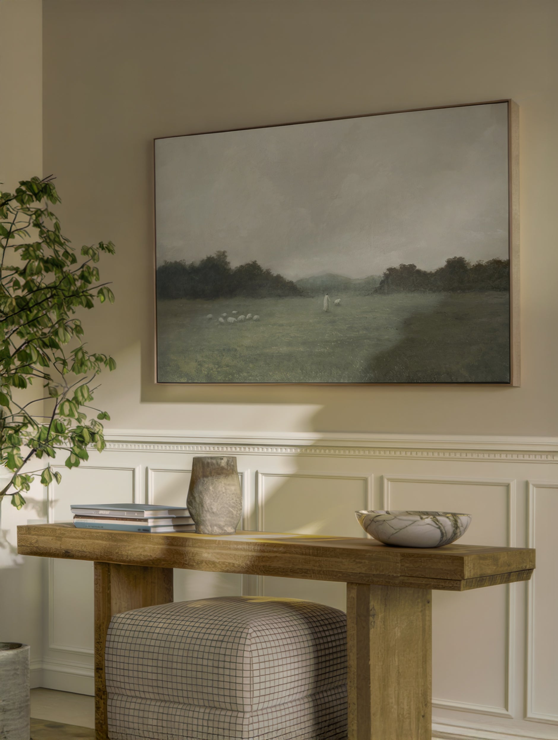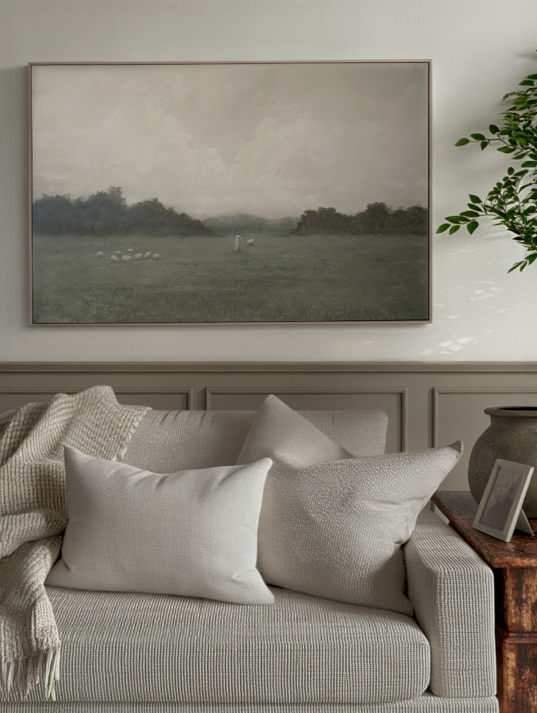 The Lord Is My Shepherd premium canvas print. Jesus tends to a single sheep in a vast green pasture. A neutral palette of linen beige, ivory sky, and muted sage shapes a peaceful horizon. Feathered brushwork on distant hills and trees gently leads the eye toward the Shepherd.