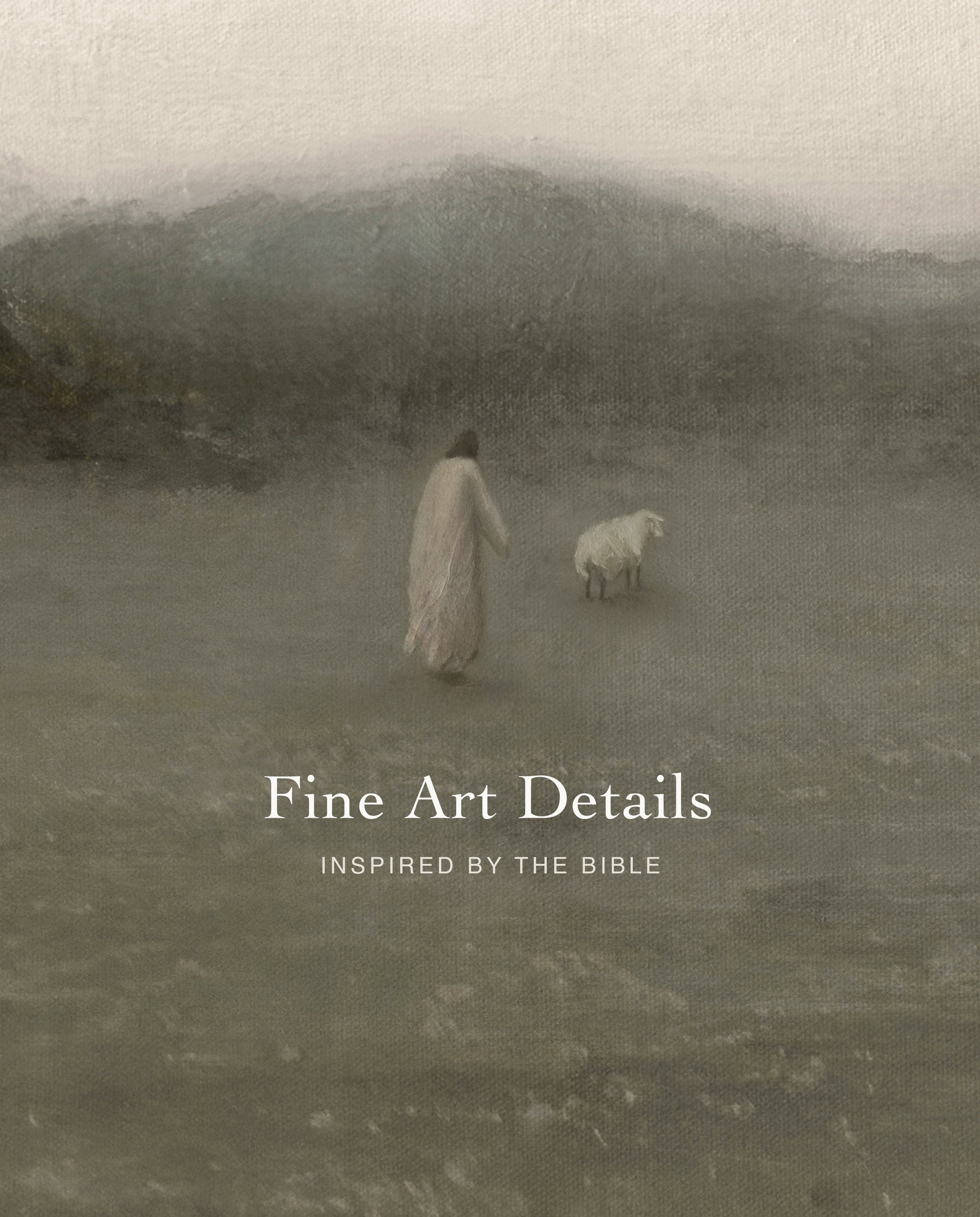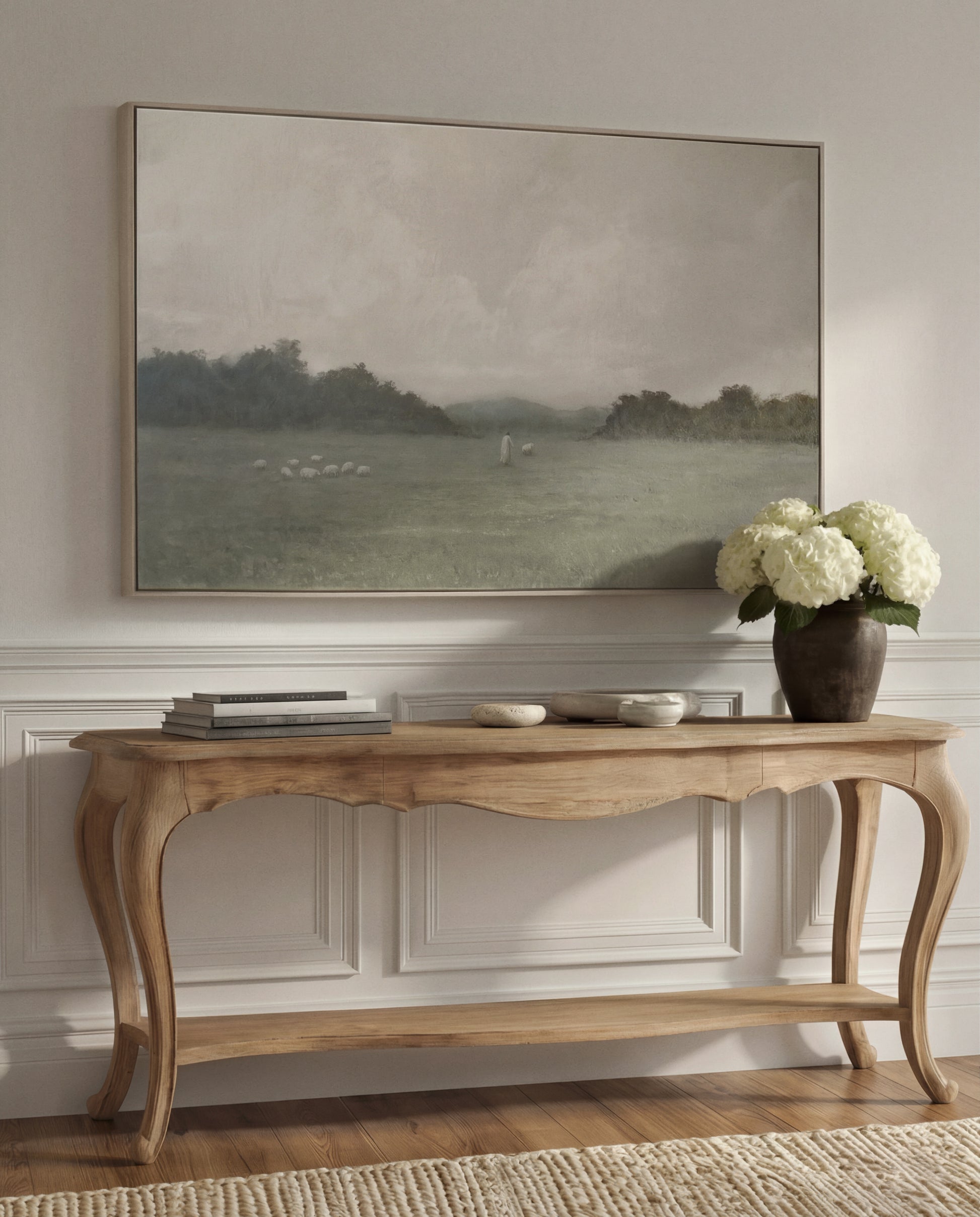 The Lord Is My Shepherd premium canvas print. Jesus peacefully tends to His sheep in vast green pastures. A neutral palette of linen beige and muted sage wraps the landscape in calm. Distant hills and trees gently lead the eye toward the Shepherd.