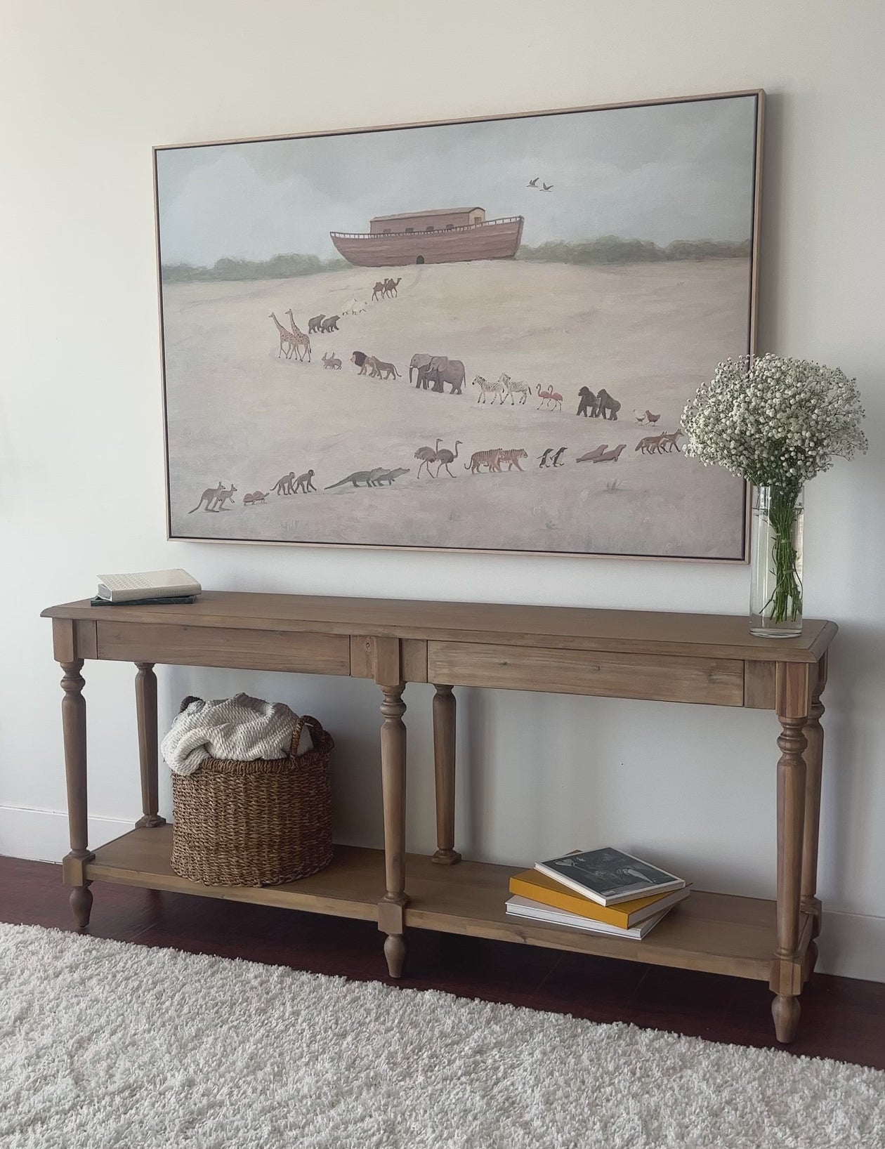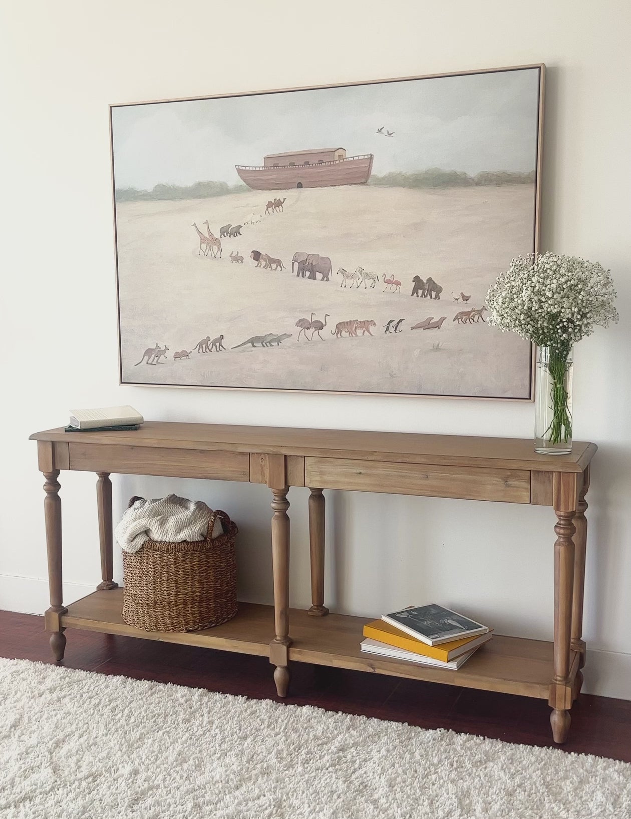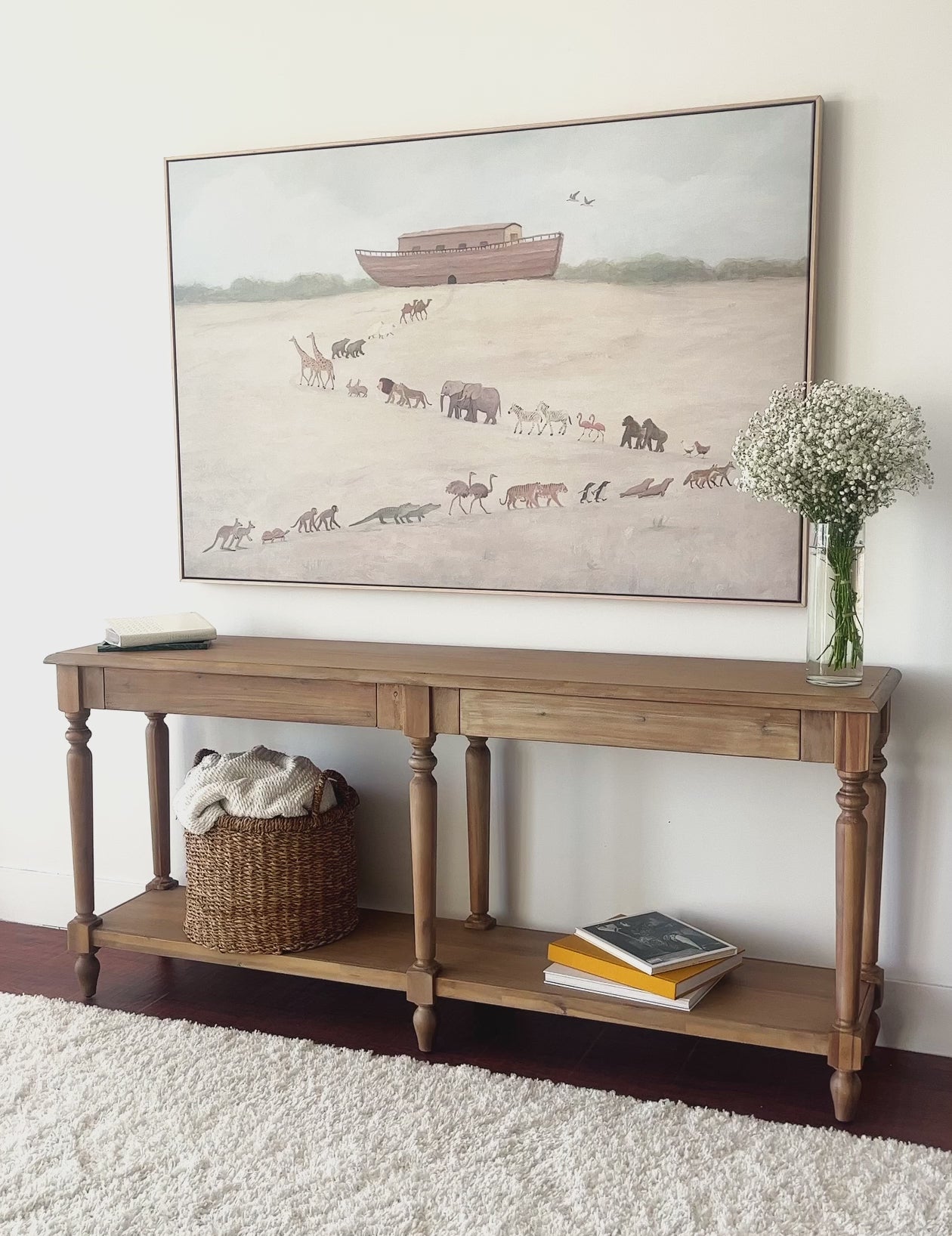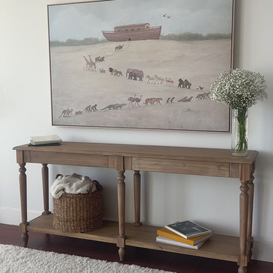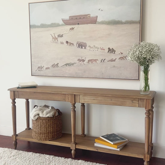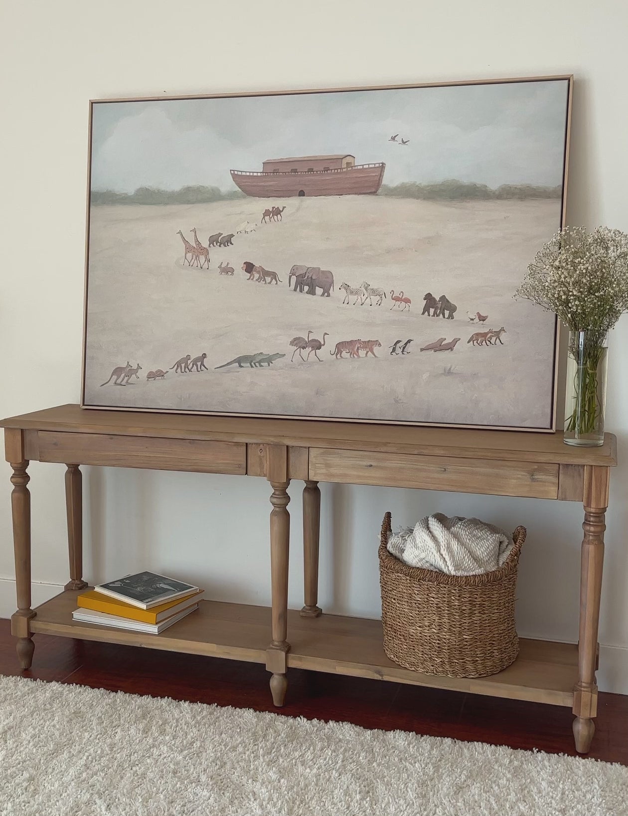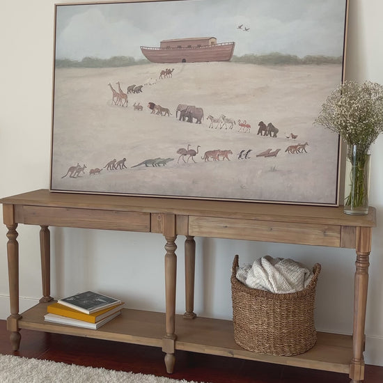 Noah's Ark premium canvas print. Featuring 42 hand-painted animals in 21 pairs. From elephants to lions, bears to penguins, the animals move peacefully toward the ark's safety. Set on soft and neutral tones. Inspired by the Bible.